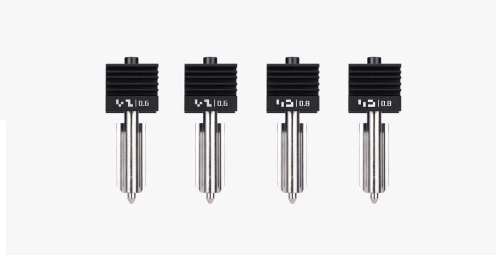 - الفوهات الأكبر 0.6 مم و 0.8 مم مثالية للخيوط المقوّاة أو المعدنية، لأنها تقلل من خطر الانسداد والتآكل وتزيد من قوة الطباعة وسرعتها.