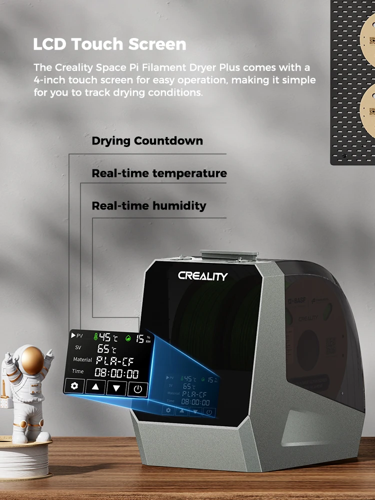 The Creality Space Pi Filament Dryer Plus comes with a 4-inch touch screen for easy operation, making it simple for you to track drying conditions.