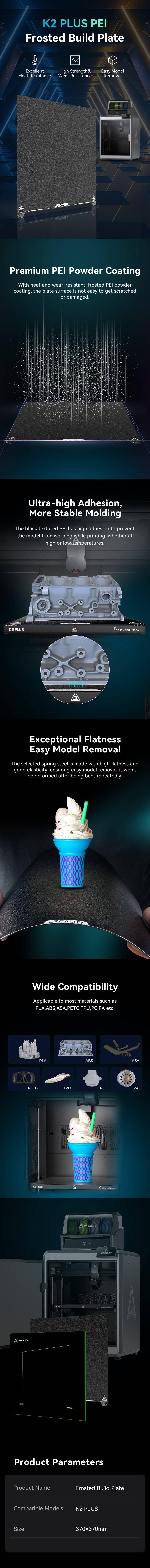 لوح بناء PEI لطابعة Creality K2 Plus هو حل مبتكر لتحسين أداء الطباعة وجودتها. يتميز هذا اللوح بسطح PEI الذي يعزز الالتصاق الجيد للطباعة على مدار العملية ويوفر نتائج دقيقة وعالية الجودة.