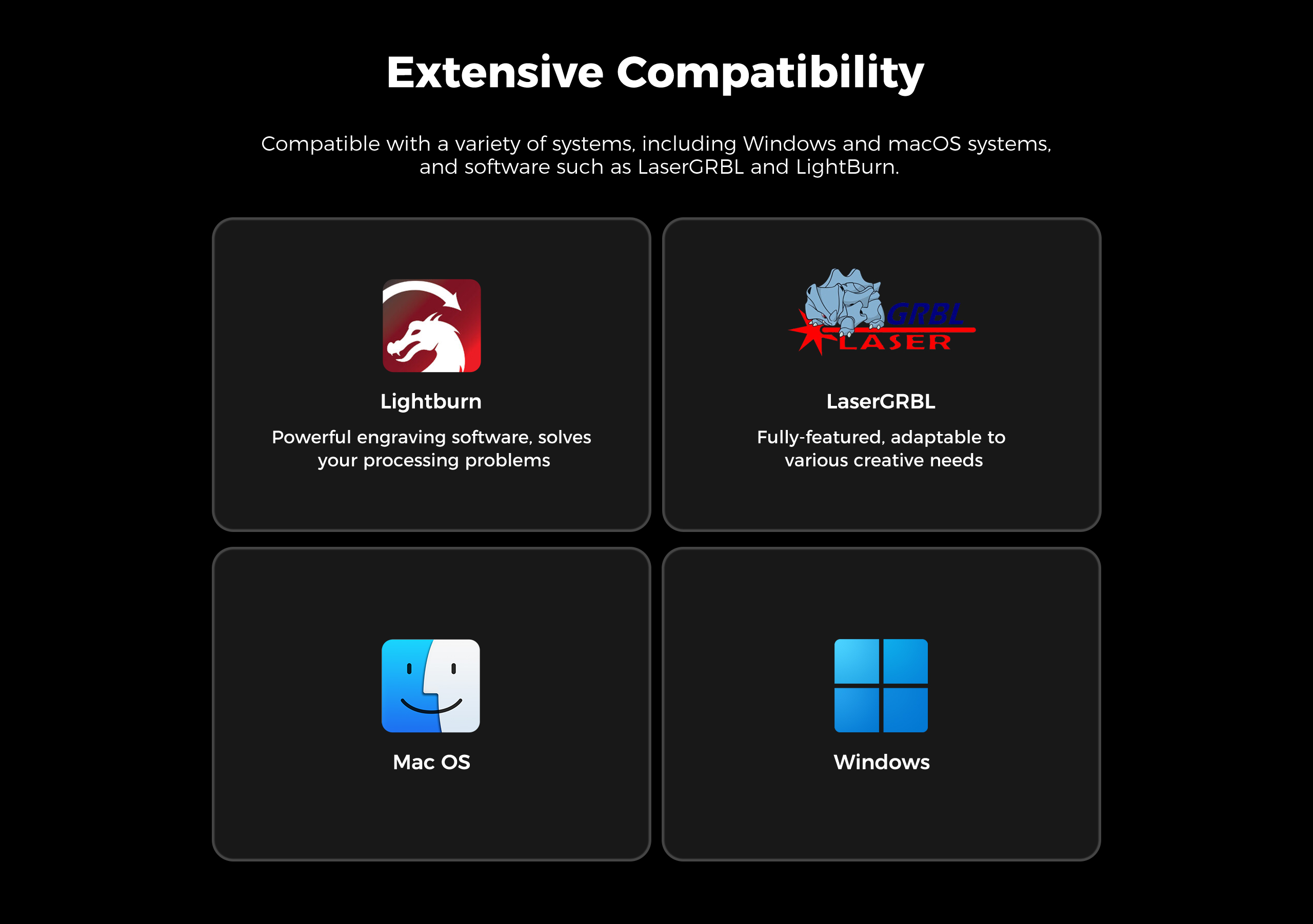 - Compatible Software: LightBurn, LaserGRBL