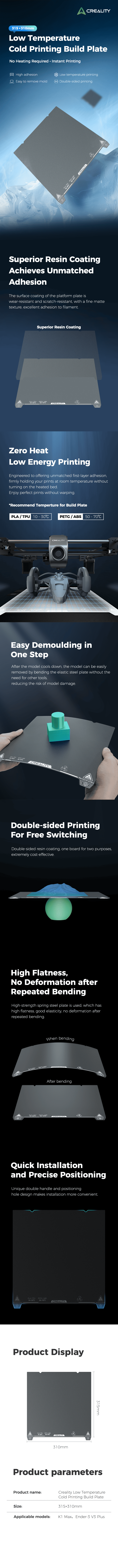 سطح طباعة مبتكرة من Creality تسمح بالطباعة مباشرة دون الحاجة لتسخين السطح. تتميز بلصق قوي عند الطباعة وإزالة سهلة للنماذج بعد الانتهاء، مما يوفر تجربة سلسة وعملية. كما أنها تدعم الطباعة على الجانبين لزيادة العمر الافتراضي والاستخدام المتكرر.